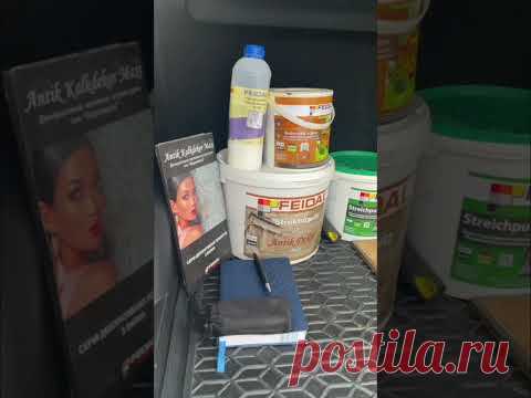 На изображении видно багажное отделение автомобиля, в котором находятся различные предметы. В центре внимания ведра и банки с краской бренда "FEIDAL", которые расположены на сером полу багажника. Рядом находится белая пластиковая бутылка с жидкостью с синей крышкой. Спереди лежат два рекламных буклета с изображением женщины и надписью "Anik Kalender-Mai", а также синий блокнот с черной ручкой. Свет фонового освещения приглушённый, что придаёт изображению рабочую атмосферу.