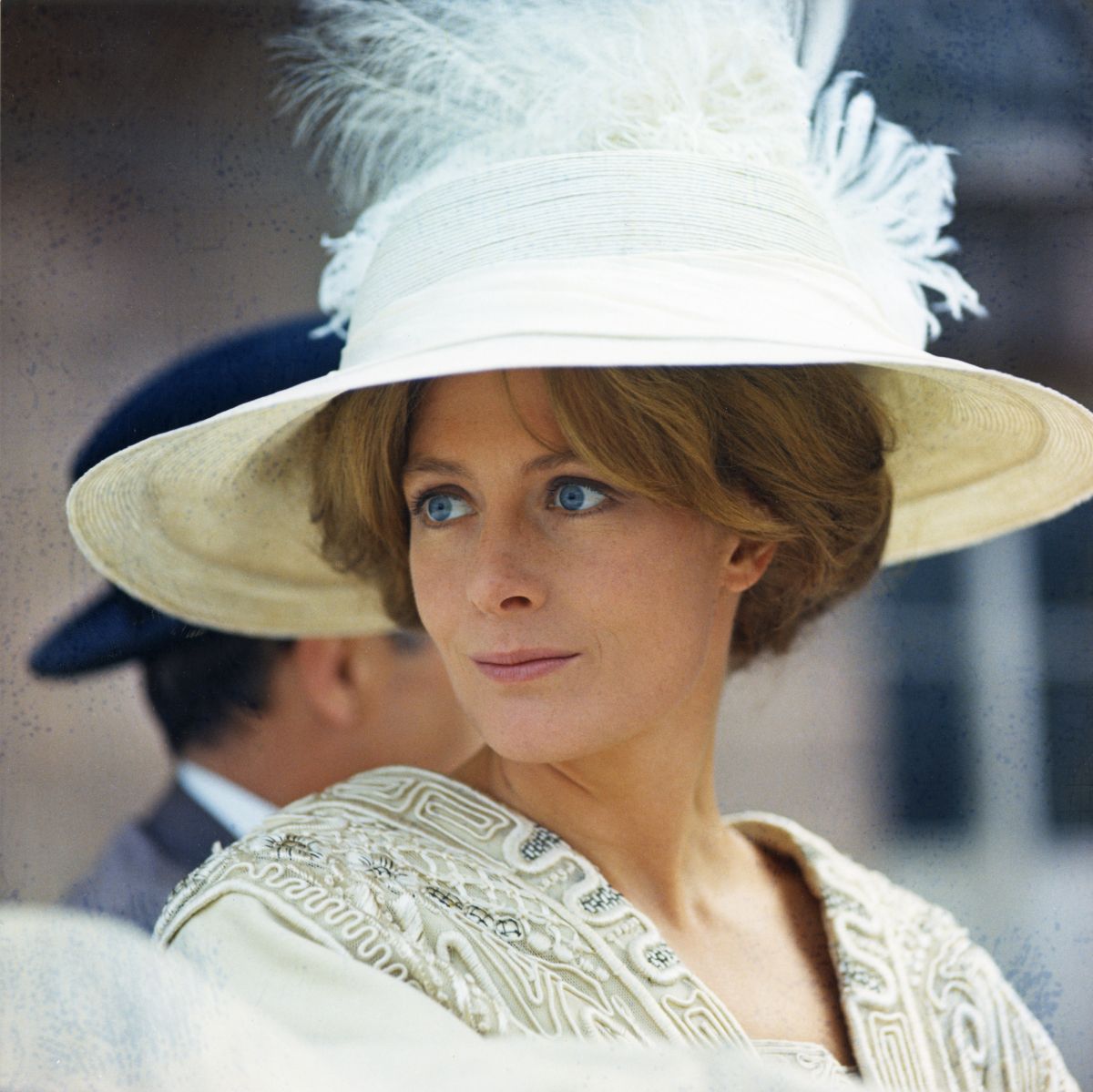 На изображении изображена женщина с выразительными голубыми глазами, одета в элегантное платье с вышивкой, окрашенное в бежевые и кремовые тона. Ее образ дополнен широкой шляпой светлого оттенка с перьями, которую она грациозно носит на своих светло-каштановых волосах. Шляпа придает образу ретро-стиль, характерный для начала 20 века. На фоне видно размытие, создающее ощущение сфокусированности на главной фигуре. Настроение фотографии отражает утонченность и стильность, характерные для определенной исторической эпохи.