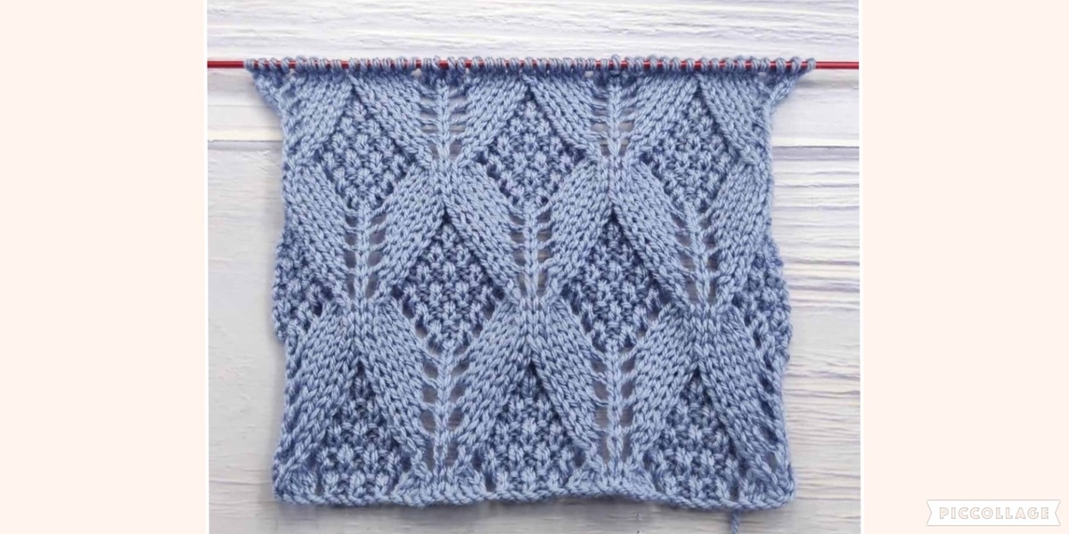 На изображении представлен образец вязания спицами, выполненный из пряжи нежного голубого цвета. В центре внимания сложный ажурный узор, который образует ряды диагональных линий и ромбов, придающих изделию утончённый и изысканный вид. В каждом ромбе можно заметить продуманные детали из разных видов петель, что добавляет узору объема и текстурности. Пряжа, вероятно, из шерсти или другой мягкой ткани, что видно по её текстуре. Узоры имеют симметричное расположение, и их акцент подчёркнут ровными рядами. Вся работа закреплена на спицах красного цвета, чей контрастный оттенок выделяет вязание на фоне светлого деревянного стола. Фон уравновешивает композицию благодаря своей текстуре из широких горизонтальных полос натурального дерева. Изображение бережно демонстрирует мастерство и аккуратность в изготовлении данной работы, что может быть особенно привлекательно для любителей вязания.