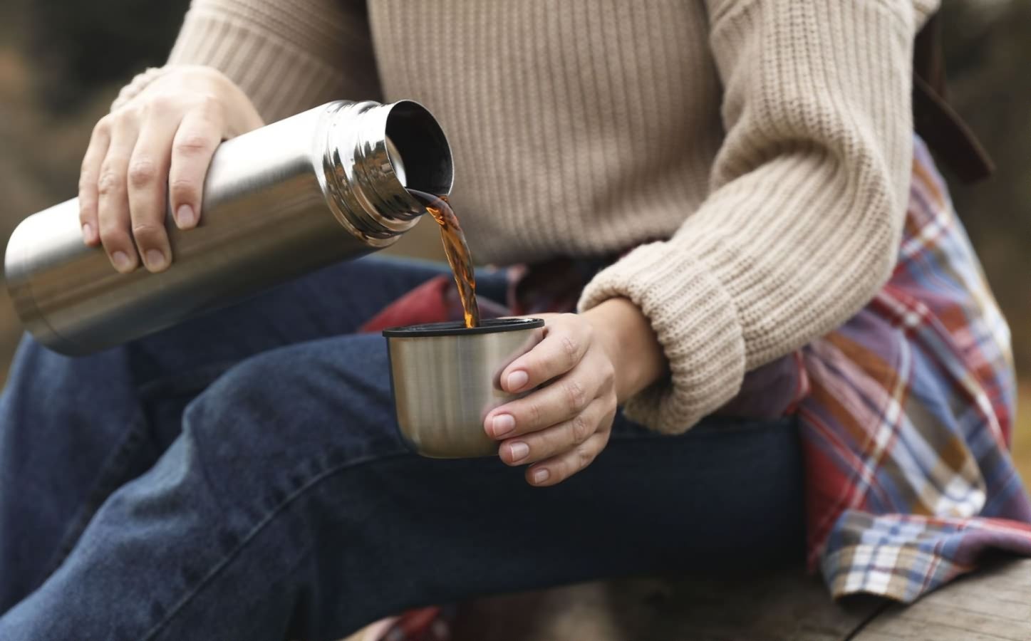 На изображении запечатлен момент, когда человек наливает горячий напиток из термоса в металлическую кружку. Человек одет в темно-синие джинсы и светлый свитер, что создает ощущение прохладной погоды. Плотная вязка свитера подчеркивает уют и тепло. Термос и кружка выполнены из нержавеющей стали с матовой поверхностью. На заднем плане виден размытый природный фон, что может указывать на то, что действие происходит на открытом воздухе, возможно в лесу или парке. Атмосфера изображения спокойная и уединенная, подчеркивая моменты наслаждения природой и теплыми напитками. Видны также детали клетчатого пледа или рубашки, что добавляет цветовое разнообразие в эту уютную сцену.