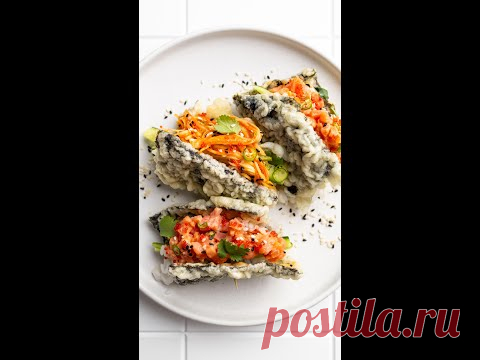 На изображении представлены три кулинарные композиции, размещенные на белой круглой тарелке. Внешне они напоминают тако, но вместо традиционной лепешки используются обжаренные в темпуре листы нори, выглядящие хрустящими и золотисто-сероватыми. Каждый кусочек наполнен яркими свежими ингредиентами: виделись линии моркови, обладающие насыщенным оранжевым цветом, листики свежей зелени, вероятно кориандра, и кусочки алого лосося с мягкой текстурой. Также присутствует нарезанный зеленый лук и мелкие черные семена кунжута для дополнительного вкуса и текстуры. Вся композиция выполнена в японском стиле умами и ассоциируется с атмосферой восточной кухни. Белая глазурованная тарелка формирует контрастный фон, подчеркивая яркость ингредиентов. Все это расположено на светлом плиточном столе, что создает ощущение чистоты и изысканности при подаче.