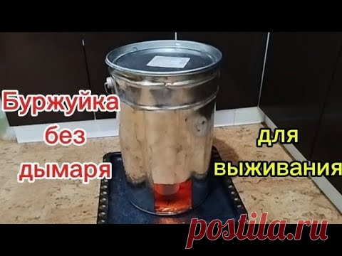 На изображении представлена самодельная буржуйка без дымаря, сделанная из металлической ёмкости цилиндрической формы. Она размещена на темной металлической подставке для безопасности, предположительно, чтобы предотвратить контакт с полом. Сверху на буржуйке видны крышка и небольшое отверстие, вероятно, для доступа или контроля. Внизу через стенки просвечивает красноватый свет, указывающий на источник тепла. На буржуйке есть инструкции на русском языке: "Буржуйка без дымаря" и "для выживания", подчеркивающие её целевое назначение в экстренных ситуациях. На заднем фоне видна стена и часть мебели темного цвета, что может свидетельствовать о нахождении буржуйки в закрытом помещении. На изображении также присутствует водяной знак с надписью "postila.ru", указывающий на источник материала или платформу, где изображение впервые могло быть размещено.