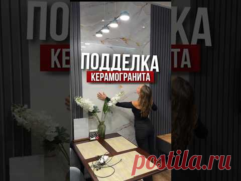 На изображении представлена пластиковая кухня, оформленная в современном стиле. В центре внимания находится стена, сделанная из материала, напоминающего мрамор, однако надпись указывает на то, что это подделка керамогранита. Помещение освещено несколькими потолочными светильниками. На столе расположены декоративные элементы, такие как плетеная подставка и ваза с белыми цветами, придающие комнате уют. Женщина в черном платье обращена к стене и, подняв обе руки, касаясь ее поверхности, вероятно, демонстрирует качество или внешний вид материала. Атмосфера комнаты спокойная и современная, что подчеркивает минималистичный дизайн мебели и отделки.