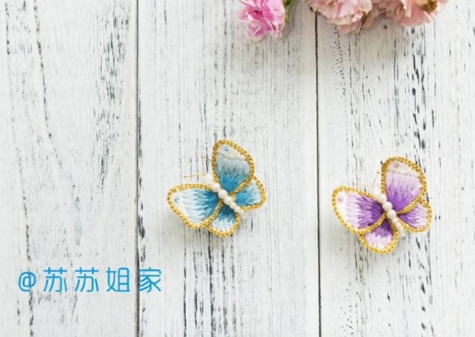 На изображении представлена белая деревянная поверхность с двуцветными декоративными бабочками, прикрепленными на ней. Одна бабочка имеет голубые и белые оттенки крыльев, обрамленных золотой каймой, другая — фиолетовые и белые оттенки с той же золотой каймой. В правом верхнем углу видны нежно-розовые цветы, добавляющие композиции романтический и элегантный вид. Логотип "postila.ru" в правом нижнем углу и китайские символы с синим текстом в левой части изображения указывают на источник и, возможно, на автора работы. Всё окружено уютной и спокойной атмосферой, идеально подходящей для домашнего декора.