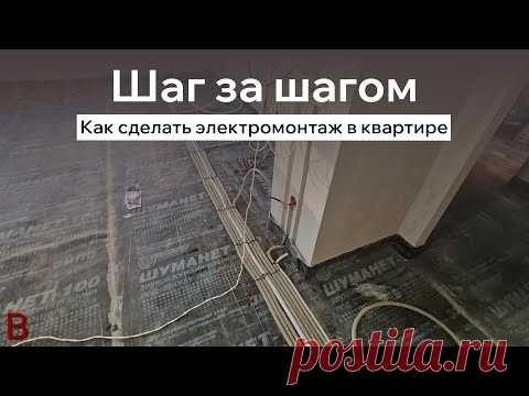 На изображении показан процесс электромонтажа в помещении, как указано на верхней части изображения надписью "Шаг за шагом. Как сделать электромонтаж в квартире". На полу виден строительный материал, изоляция марки "Шуманет 100", покрывающий всю поверхность. В центре изображения вдоль пола проходит несколько каналов или труб для проводки, аккуратно уложенные и подготовленные для дальнейшей работы. Вокруг канала лежат электрические провода и кабели, которые, вероятно, будут использоваться в процессе монтажа. В глубине изображения видна стена с гладкой светлой штукатуркой. Общая атмосфера изображения отражает профессионально выполняемую работу в стадии подготовки, свидетельствующую о начальном этапе или середине электромонтажных работ. Цветовая палитра изображения нейтральная, с преобладанием серых и белых оттенков. На изображении также присутствует лого "postila.ru", возможно указывающее на ресурс, с которого взята информация.