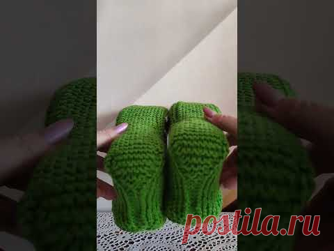 На изображении представлены две пары зеленых вязаных носков, удерживаемых двумя руками с розовым маникюром. Носки имеют яркий зеленый цвет и изготовлены из толстых ниток, с видимым узором вязки, что создает ощущение мягкости и тепла. Руки держат носки таким образом, что подошвы обращены вперед. Фон изображения нейтральный, с белой стеной, а нижняя часть композиции располагается на светлой кружевной скатерти, что придает фото ощущение домашнего уюта и комфорта. Весь образ говорит о тепло и заботе, которая часто ассоциируется с вручной работой вязания.