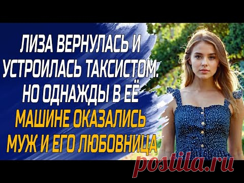 На изображении представлен текст и фотография женщины. Текст занимает левую часть изображения, написан белыми и желтыми буквами на синем фоне. В нем говорится о некой Лизе, которая вернулась и устроилась таксистом, и однажды в ее машине оказались муж и его любовница. Справа изображена молодая женщина с длинными светлыми волосами, одетая в темное платье с пуговицами. Она находится на улице, окруженной зеленью, возможно, в парке или саду. Атмосфера кажется спокойной и летней. Внизу справа изображено имя сайта — postila.ru.