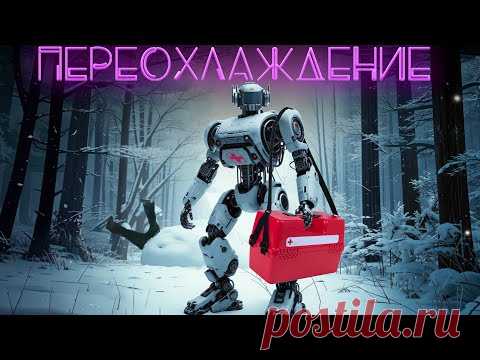 Изображение показывает робота в зимнем лесу, антураж которого подчеркивает атмосферу холода и отчужденности. На роботе преобладают белые и черные оттенки, его дизайн напоминает футуристический. Он несет красный ящик с белым крестом, очевидно, аптечку. Над ним яркая надпись "ПЕРЕОХЛАЖДЕНИЕ" в неоновом стиле, придающая сюжету предупреждающий тон. Фон состоит из заснеженных деревьев, создавая ощущение глубокой зимы с снежным покровом на земле.