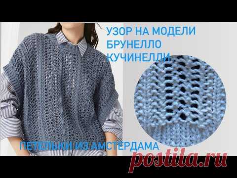 Изображение представляет модель одежды бренда Брунелло Кучинелли. На картине изображён человек, одетый в объемный серый вязаный свитер с ажурным узором, надетый поверх классической рубашки в тонкую синюю полоску. Свитер выполнен крупной вязкой, что подчеркивает его текстуру и придаёт изделию современный вид. На светло-сером фоне дана крупная вставка, показывающая деталь вязки крупным планом, что позволяет увидеть особенности узора. Текст на изображении сообщает, что этот узор встречается в Амстердаме. В целом, снимок характеризуется модным стилем и акцентом на изделиях ручной работы.