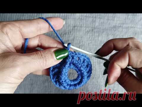 На изображении запечатлен процесс вязания крючком. Две руки удерживают вязальное полотно синего цвета в форме круга с отверстием посередине. Это может быть этап создания чего-то круглого, например, салфетки или детали одежды. Нитки выглядят мягкими и толстоватыми, что говорит о зимнем или декоративном изделии. Особое внимание привлекает лак на ногтях насыщенного зеленого оттенка, контрастирующий с синим цветом пряжи. В правой руке держат крючок для вязания, который имеет металлический блеск. Фон размытый, сероватого оттенка, не отвлекает внимание от процесса вязания. В правом нижнем углу виден логотип "postila.ru", что, вероятно, указывает на источник или создателя контента.