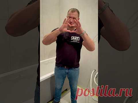 Изображение показывает человека в жилой комнате. Он стоит в ванной комнате на фоне светло-серых стен, одет в черную футболку с надписью "ANT" и синие джинсы. Мужчина держит руки перед собой, формируя руками некую фигуру. Позади него видна часть белой ванны и маленький участок пола, защищенного желтой лентой. Полный интерьер выглядит лаконичным и современным. Атмосфера нейтральная, свет мягкий.