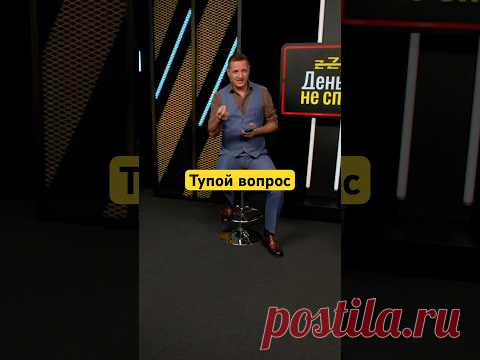 На изображении изображен мужчина, сидящий на высоком стуле в современно оформленной студии. Мужчина одет в синий костюм и коричневые туфли. Он держит в руках микрофон, и возможно участвует в записи телевизионной программы или интернет-шоу. Фон украшен яркими геометрическими элементами и светодиодными полосами. На заднем плане виден черный экран с текстом "Деньги не спят", а рядом желтая табличка с надписью "Тупой вопрос". Атмосфера профессиональная и интерактивная, предрасполагающая к обсуждению финансовых тем или текущих событий. Между стулом и стеной также видны светоотражающие панели, которые придают пространству динамичный вид.