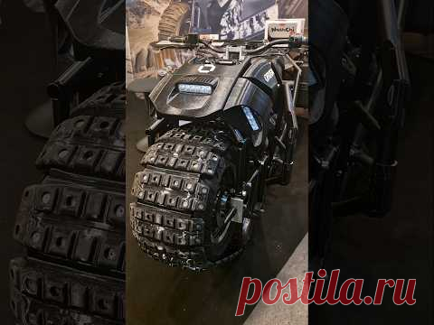 На изображении представлен массивный, высокотехнологичный мотоцикл с широкой, мощной и прочной цепной гусеницей вместо заднего колеса. Он выполнен в тёмных тонах, преимущественно черного цвета, с металлическими и пластиковыми элементами, придающими ему современный и агрессивный вид. Гусеница явно усилена для максимальной проходимости по сложным поверхностям, что подчеркивает его предназначение для экстремальных условий. На передней части мотоцикла заметен фара прямоугольной формы, которая интегрирована в обтекаемый корпус. Ручки и каркас выполнены с учетом эргономики, что говорит о внимании к удобству управления. На заднем плане можно увидеть постеры или изображения горных ландшафтов, создающие атмосферу приключений и внедорожных путешествий.