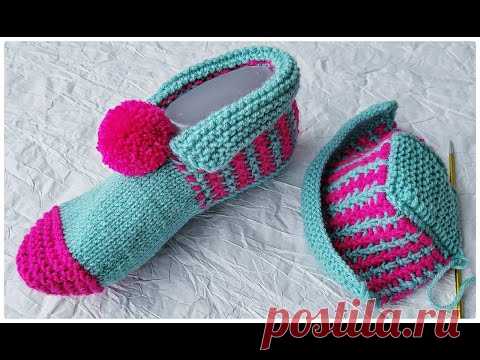 На изображении представлены две вязаные работы. Справа мы видим носок или тапок яркого бирюзового цвета с малиновыми элементами. Он украшен крупным помпоном спереди, что добавляет ему игривый вид. Основная часть носка выполнена из плотной бирюзовой пряжи, а малиновая пряжа выделяет мысок и пятку, создавая контраст. Полоска на задней части изделия выполнена в полосатой технике с чередованием бирюзового и малинового цветов. Справа от носка лежит шапочка, выполненная в аналогичной цветовой гамме. Ее основная часть также связана из бирюзовой пряжи, а полосы чередуют бирюзовые и малиновые элементы, повторяя узор носка. Фоном служит светлая текстурированная поверхность, которая подчеркивает яркость цветов изделий.