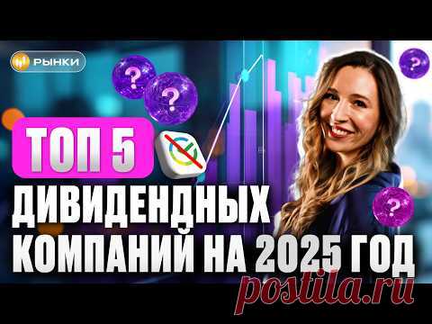 На изображении представлен коллаж, посвященный теме инвестиций. В центре размещена женщина с длинными светлыми волосами и улыбкой, одетая в темную одежду. На переднем плане выделяются крупные ярко-розовые буквы, составляющие надпись: "ТОП 5 дивидендных компаний на 2025 год". Справа от них изображены графики с восходящими линиями, символизирующие рост и успех в инвестициях. На фоне видны фиолетовые круги с вопросительными знаками, что создает атмосферу интриги и неизвестности. В левом верхнем углу находится логотип с надписью "Рынки" на фоне золотистой монеты, что намекает на финансовую тематику. В правом нижнем углу видна подпись "postila.ru", указывающая на источник или платформу, с которой связано изображение. Вся композиция выполнена в ярких контрастных цветах, таких как розовый, фиолетовый и синий, что привлекает внимание зрителей и добавляет динамику изображению.