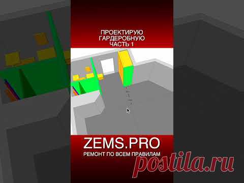 На изображении представлена графическая схема, созданная для проекта под названием "Проектирую гардеробную. Часть 1". Верхний половина изображения содержит текст белого цвета на ярком красном фоне, где указывается название проекта. В центральной части показана трехмерная модель планировки помещения гардеробной, выполненная в ярких цветах: зеленом, желтом и сером, что символизирует различные элементы мебели или стены. Внизу мы видим логотип "ZEMS.PRO" и лозунг "Ремонт по всем правилам", написанные белым текстом на красном фоне. Справа внизу присутствует небольшой логотип "postila.ru", что указывает на происхождение изображения. Визуальный стиль достаточно минималистичный, но акцентирован на цветах для ясности и выделения структурных элементов гардеробной, что может быть полезно при планировании интерьера.