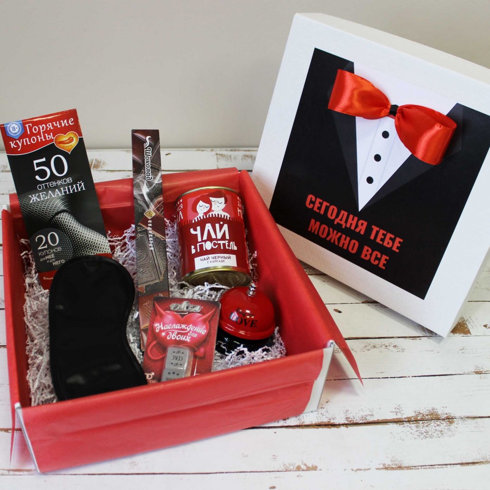 На изображении представлена подарочная коробка, украшенная в красно-белой цветовой гамме. Внутри коробки расположены различные предметы, такие как черная глазная маска, упаковка чая "Чай в постель", шоколадный батончик и карточная игра с надписью "50 оттенков желаний". На упаковке присутствуют надписи, оформленные яркими шрифтами. Коробка, в которой лежат эти предметы, устелена белой бумагой. Рядом с ней находится декоративная коробка с рисунком фрака и красной бабочкой, на которой написано "Сегодня тебе можно все". Весь набор создаёт атмосферу романтики и игривости, предполагая использование в особых случаях.