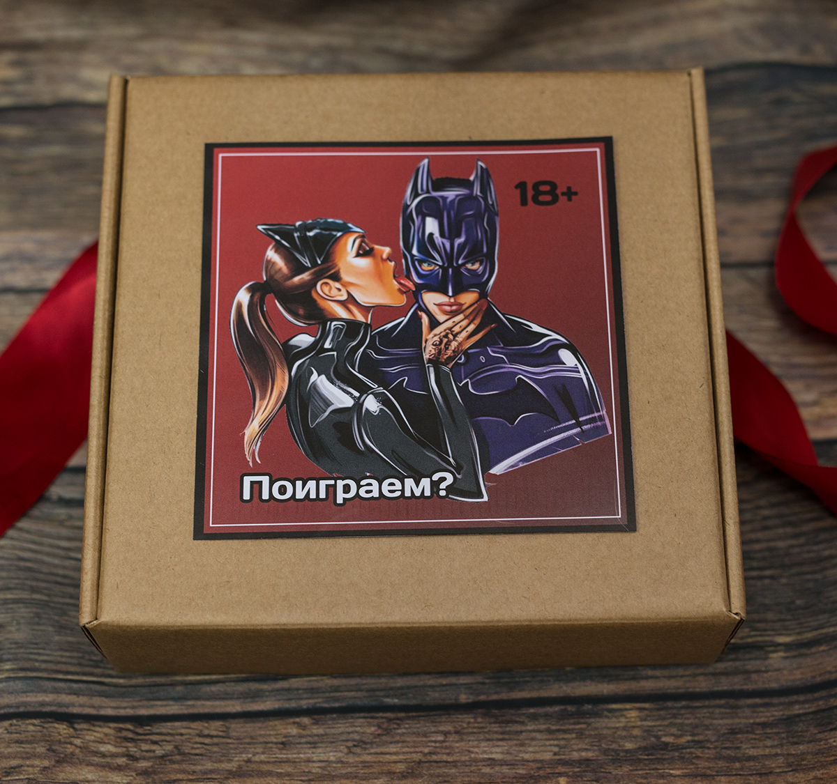 На изображении представлена картонная коробка нейтрального коричневого цвета, на которой приклеена квадратная наклейка с иллюстрацией. На наклейке изображены два известных персонажа в костюмах: справа — человек в костюме Бэтмена с характерной маской, а слева — женщина в костюме Женщины-кошки с длинными волосами. На ее голове надет ободок с кошачьими ушками. Иллюстрация выполнена в ярких цветах, на красном фоне, в верхнем углу указан возрастной рейтинг 18+. В нижней части наклейки располагается надпись "Поиграем?". Коробка выглядит запечатанной и украшена красной лентой сбоку на деревянной поверхности. Атмосфера изображения намекает на элементы интриги и игры, что видно из выбора персонажей и сопровождающей надписи.