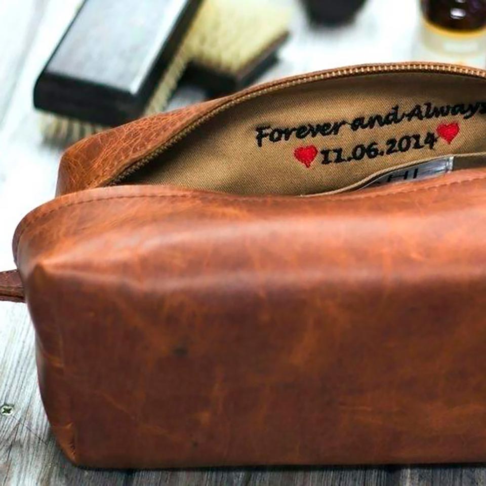 На изображении показана кожаная косметичка цвета коричневый коньяк, размещенная на деревянной поверхности. Внутри сумки видна надпись черными шрифтами "Forever and Always" и дата "11.06.2014", между которыми вышито два красных сердца. Фон украшен расфокусированными кистями для ухода и бутылкой, что создает атмосферу повседневного ухода и стиля. Видна текстура кожи, придающая изделию винтажный, но аккуратный вид. В комнате господствует теплая цветовая палитра, сочетающая коричневые и кремовые тона.