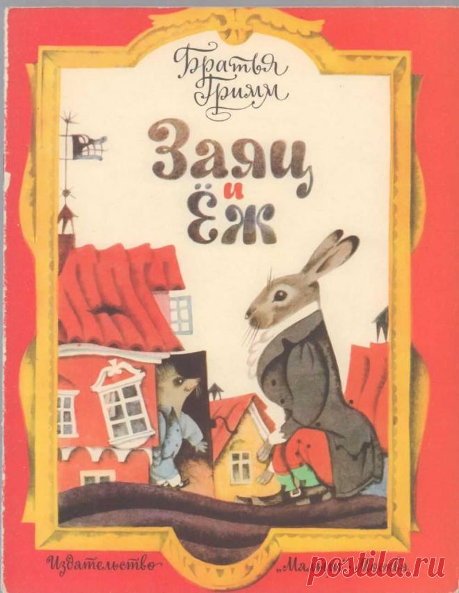 На изображении обложка книги "Заяц и ёж" авторства Братьев Гримм. Обложка выполнена в ярких, насыщенных цветах с использованием красного и золотого обрамления. Центральное место занимает изображение зайца в элегантном черном сюртуке, прогуливающегося по деревенской улице, где за домом выглядывает ёж в голубом наряде. Дома изображены в мультяшном стиле, крыши ярко-красные. Вверху обложки ручная надпись "Братья Гримм", а внизу указано издательство "Малыш". Атмосфера сказочная и теплая, дизайн вдохновляет на фантазию и привлекает внимание детей.