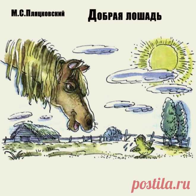 На изображении представлена иллюстрация из детской книги, автором которой является М.С. Пляцковский, с названием "Добрая лошадь". В центре внимания крупная голова лошади с добродушным выражением, которая наклоняется к зелёному утёнку. Лошадь изображена с длинной светло-коричневой гривой, ее уши повернуты вперед, словно она сосредоточена на утёнке. Утёнок внизу картины подпрыгивает, распростёртые крылья придают ему задорный вид. На заднем плане забор и деревенский пейзаж с домиком, окружённым деревьями. Вокруг изображены лёгкие облака, а солнце светит сквозь них, заливая всё пространство мягким светом. Ощущение тепла и умиротворения исходит от сцены, подчеркивая добросердечие изображённой лошади.