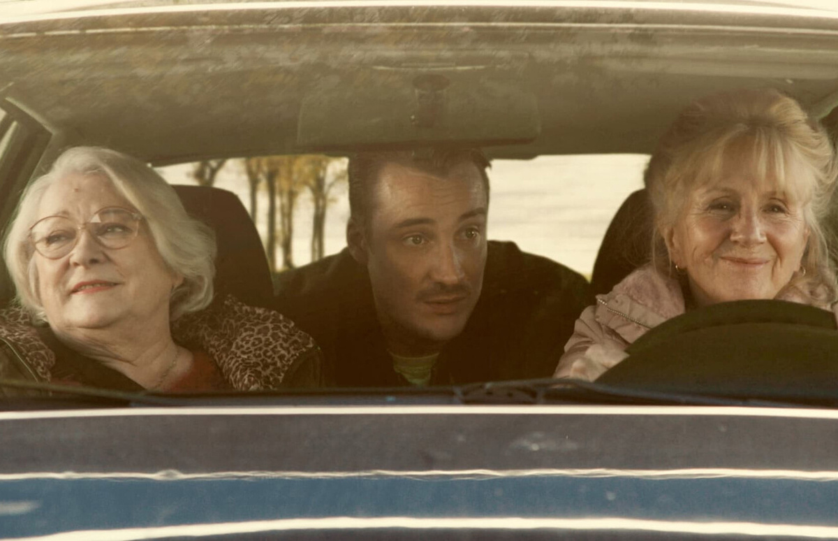 На изображении три человека в автомобиле, который движется по заснеженной дороге. На переднем плане, в центре, сидит мужчина средних лет с задумчивым выражением лица, а по бокам две пожилые женщины. Одна из женщин, сидящая за рулём, выглядит весёлой и спокойной, с улыбкой на лице. Она одета в светлый свитер с шарфом. Другая женщина, на пассажирском сиденье, смотрит в сторону; она носит очки и чёрную накидку. За окном автомобиля виден снежный пейзаж с редкими деревьями. Атмосфера снимка спокойная и немного ностальгическая, как будто герои персонажей отправлены в экзистенциальное путешествие сквозь зимнюю природу. Изображение содержит приятные оттенки зимнего времени и создаёт уютное чувство путешествия в холодный день.