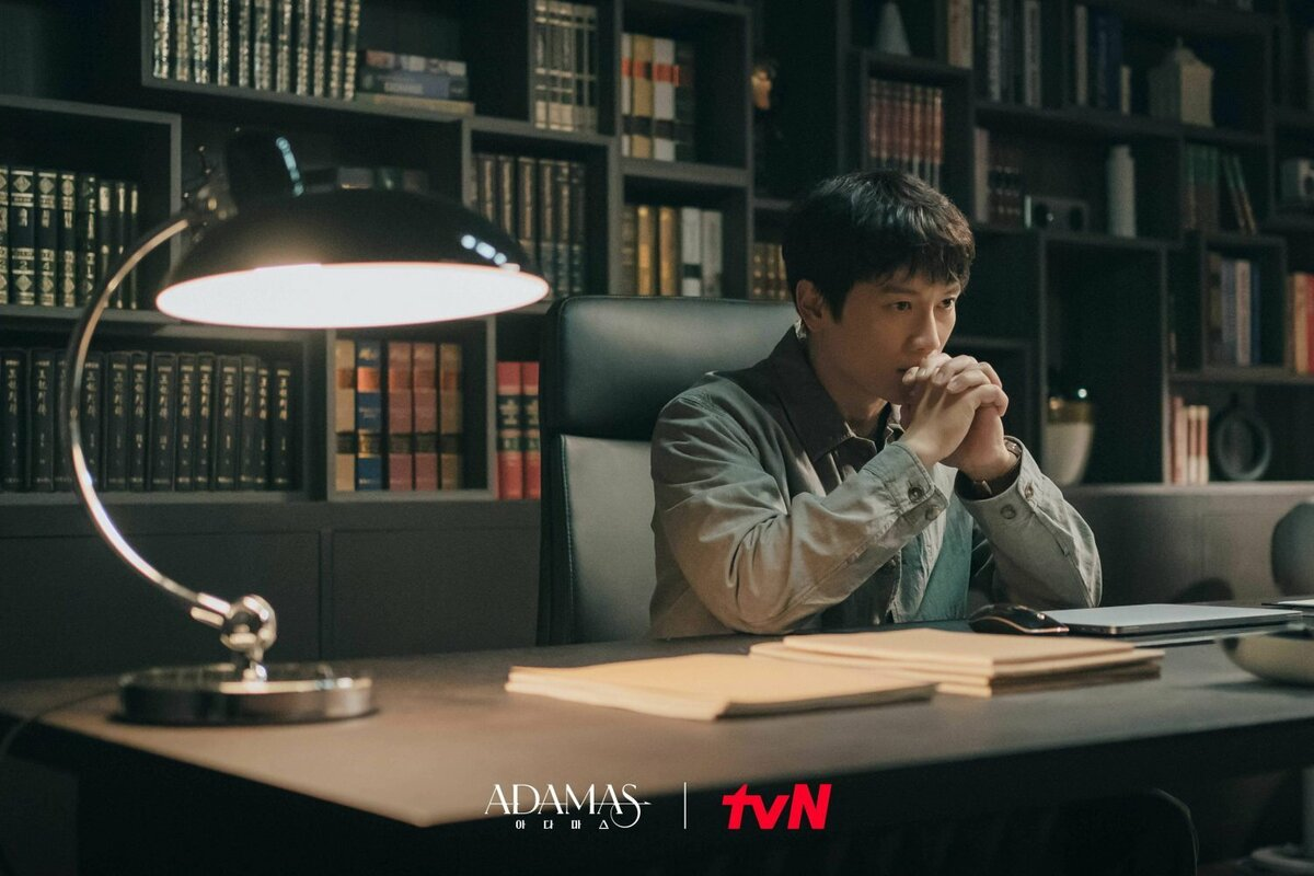 На изображении показан молодой мужчина, сидящий за массивным столом в стильном офисе или кабинете. Он задумчиво сложил руки перед лицом, глубокий свет настольной лампы освещает его и документы, разложенные на столе. Мужчина одет в светлую рубашку и тёмную куртку. Вся обстановка вокруг него говорит о серьёзности и важности происходящего. Позади него находится большая книжная полка, заполненная разнообразными книгами и папками, что создаёт атмосферу интеллекта и аккуратности. На изображении также видны логотипы "Adamas", "tvN" и надпись "postila.ru".