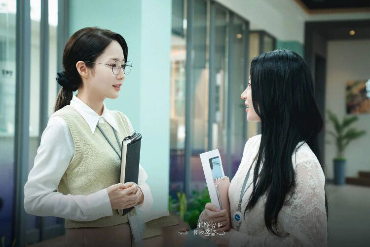 На изображении две молодые женщины, стоящие в деловой обстановке. Одна из них носит очки, одета в светлую рубашку и светло-зеленый жилет, она держит в руках черную папку. У нее длинные волнистые волосы, заколотые назад. Вторая женщина одета в белую блузку с кружевными деталями и также держит в руках какой-то журнал или книгу. Они стоят в современном офисе с большими стеклянными окнами, создающими светлую и открыту атмосферу. На заднем плане видны растения в горшках и коридор, ведущий в другие помещения, что добавляет изображениям деловой контекст и указывает на их занятость в офисной среде. Женщины ведут беседу и выглядят сосредоточенно и дружелюбно.