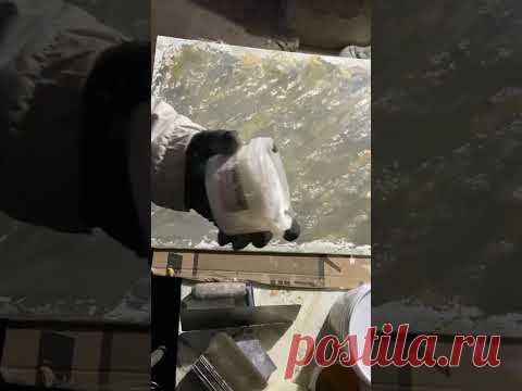 На изображении видна рука в черной перчатке, держащая небольшой пластиковый контейнер с надписью, возможно, это средство для нанесения на поверхность. Рука находится над рабочей поверхностью с неоднородным серым покрытием, которая, вероятно, является фоном или объектом обработки. На этапе подготовки или проведения ремонтных или строительных работ. Слева частично видна фигура в светлой одежде, возможно, рабочий костюм. Почти вся поверхность стола занята различными предметами и емкостями, некоторые из них металлические или пластиковые. Освещение кажется искусственным, создавая атмосферу концентрации и рабочего процесса. Обстановка свидетельствует о производственной или мастерской среде.