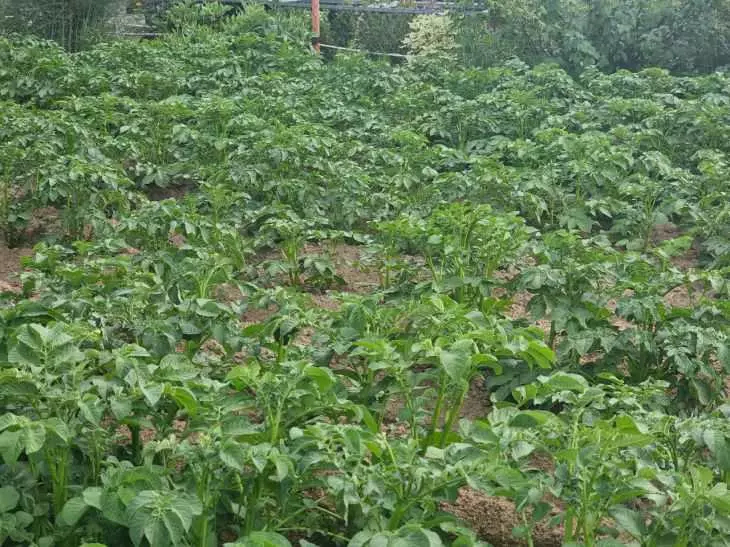 Изображение демонстрирует обширное картофельное поле на участке земли. Большое количество зелёных побегов картофеля равномерно распределено по всему участку. Некоторые растения имеют более насыщенный зелёный цвет, указывая на здоровый рост. Земля между ними хорошо ухожена, что говорит о регулярном уходе за растениями. На заднем плане видны небольшие кустарники и деревья, создающие естественное ограждение. Атмосфера спокойная, чем-то напоминает сельскую местность, где заботливо выращенные культуры дают обильные урожаи. Это типичный летний пейзаж, характерный для мест, где практикуется огородничество.