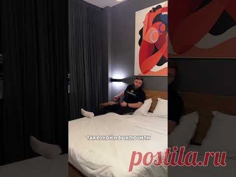 На изображении видна современная гостиничная комната с мужской фигурой, сидящей на кровати. Человек одет в черную футболку и черные брюки, он полулежит, опираясь на подушки, покрытые белым постельным бельем. На заднем плане находится темная занавеска, создающая атмосферу уюта и приватности. На стене висит абстрактная картина в красных и черных тонах, добавляющая интересный художественный акцент в интерьер. Светильник рядом с кроватью мягко освещает комнату, создавая теплую атмосферу. В нижней части изображения заметно размещен водяной знак "postila.ru", обозначающий источник изображений.