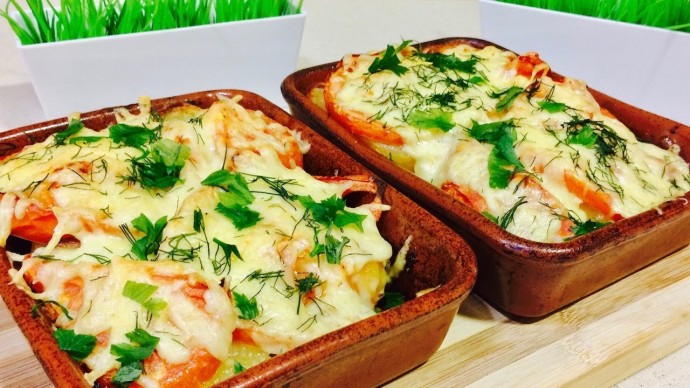 На фотографии изображено два глиняных блюда с аппетитной запеканкой, расположенных на светлой деревянной поверхности. Запеканка, украшенная свежими зелеными веточками укропа и петрушки, соблазняет нежной золотистой корочкой расплавленного сыра. Под сыром видны ломтики помидора и других овощей. Фон состоит из двух белых контейнеров с искусственными зелеными растениями, которые добавляют свежести общей композиции. Атмосфера уютная и домашняя, идеальная для теплого семейного обеда.