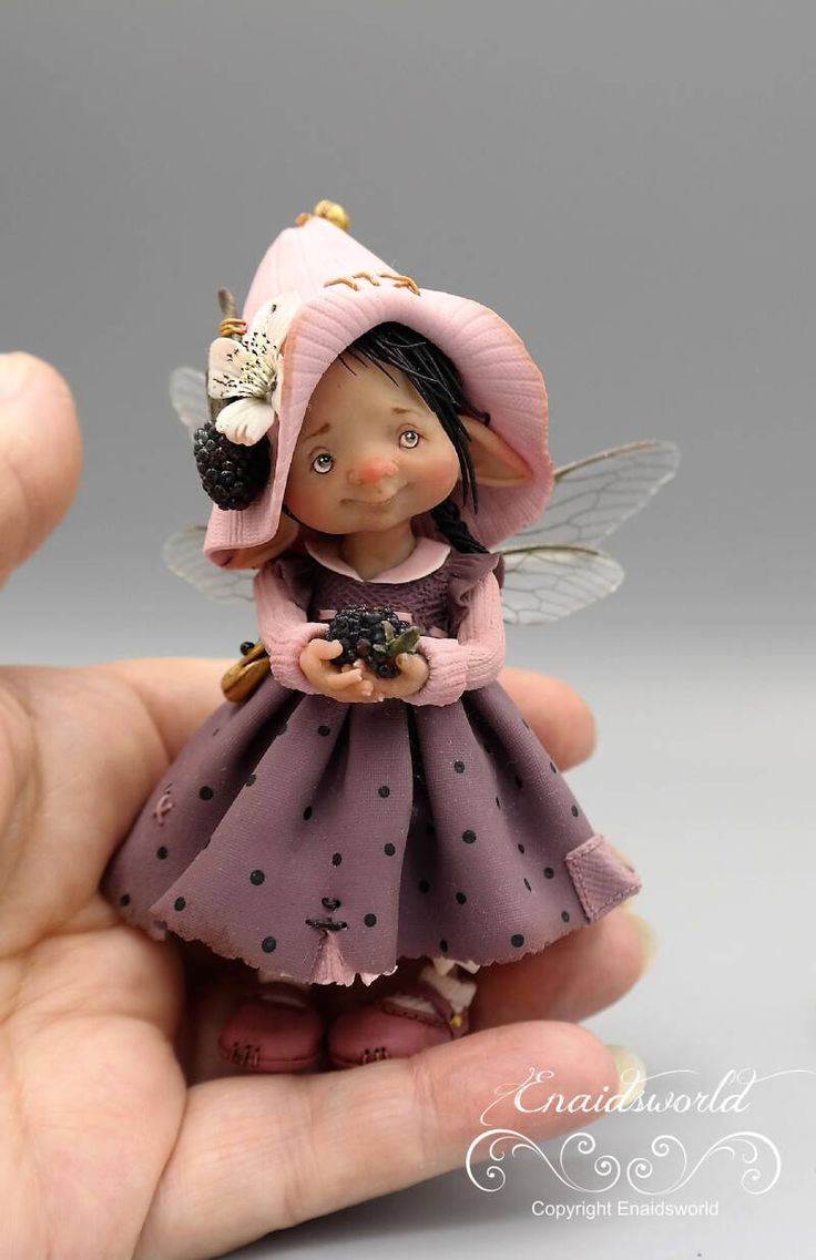 На изображении маленькая кукла-фея в задорном розовом платье с чёрными горошинами. У феи большие крылья, похожие на стрекозиные, и милая улыбка на лице. Её шляпа, напоминающая цветок колокольчика, украшена ягодами и цветами. Она держит ежевику в ладонях. Кукла находится на ладони руки, показывая её миниатюрный размер. Атмосфера изображения вызывает чувство причудливой сказочности благодаря деталям и нежным цветам.