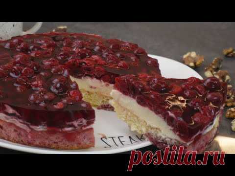 На изображении представлен аппетитный торт, состоящий из нескольких слоев. Верхний слой данного десерта выполнен из желе насыщенного бордового цвета, украшенного ягодами, предположительно клюквой или вишней, что придает ему свежий и привлекательный вид. Ниже находится слой белого крема, вероятно с нежной текстурой и сливочным вкусом. Основа торта представляет собой плотный бисквит светло-желтого цвета, который поддерживает структуру десерта. Из торта вырезан треугольный кусочек, позволяющий увидеть все его слои в разрезе, подчеркивая контраст текстур и цветов. Пирог находится на белой тарелке с надписью "STEAK", а на фоне видны орехи, которые могут быть использованы как дополнительный ингредиент или декор. Общая атмосфера изображения располагает к уютному чаепитию, создавая ощущение домашнего приготовления благодаря приглушенным тонам и простоте композиции.
