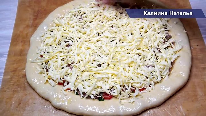 На изображении показан процесс приготовления пиццы на деревянной поверхности. Пицца имеет круглую форму с достаточно толстым краем из теста, который выглядит свежеприготовленным и блестящим от смазки. На поверхности пиццы щедро распределён натёртый сыр, который почти полностью покрывает начинку, находящуюся под ним. В основе начинки видны кусочки свежих овощей, таких как томаты и, возможно, лук. Эта кулинарная сцена создаёт атмосферу домашнего уюта и аппетитного ожидания завершённого блюда. На изображении также присутствует надпись с именем "Калинина Наталья" и логотип сайта postila.ru в правом нижнем углу. Фон изображения светлый, чтобы акцентировать внимание на фоне приготавливаемого блюда.