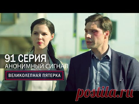 Изображение показывает двух человек, один из которых мужчина в темном костюме и светло-голубой рубашке, а другая — женщина в белом блузке и темной куртке. Оба они выглядят серьезно и целеустремленно. Мужчина имеет видимую травму на лице в виде кровоподтека. Фоновая обстановка городская, на заднем плане размытый вид зданий и уличных знаков. Изображение сопровождается текстом, который сообщает о 91 серии под названием "Анонимный сигнал" из сериала "Великолепная пятерка". Атмосфера кажется напряженной и детективной, подчеркивающей драматический характер происходящего.