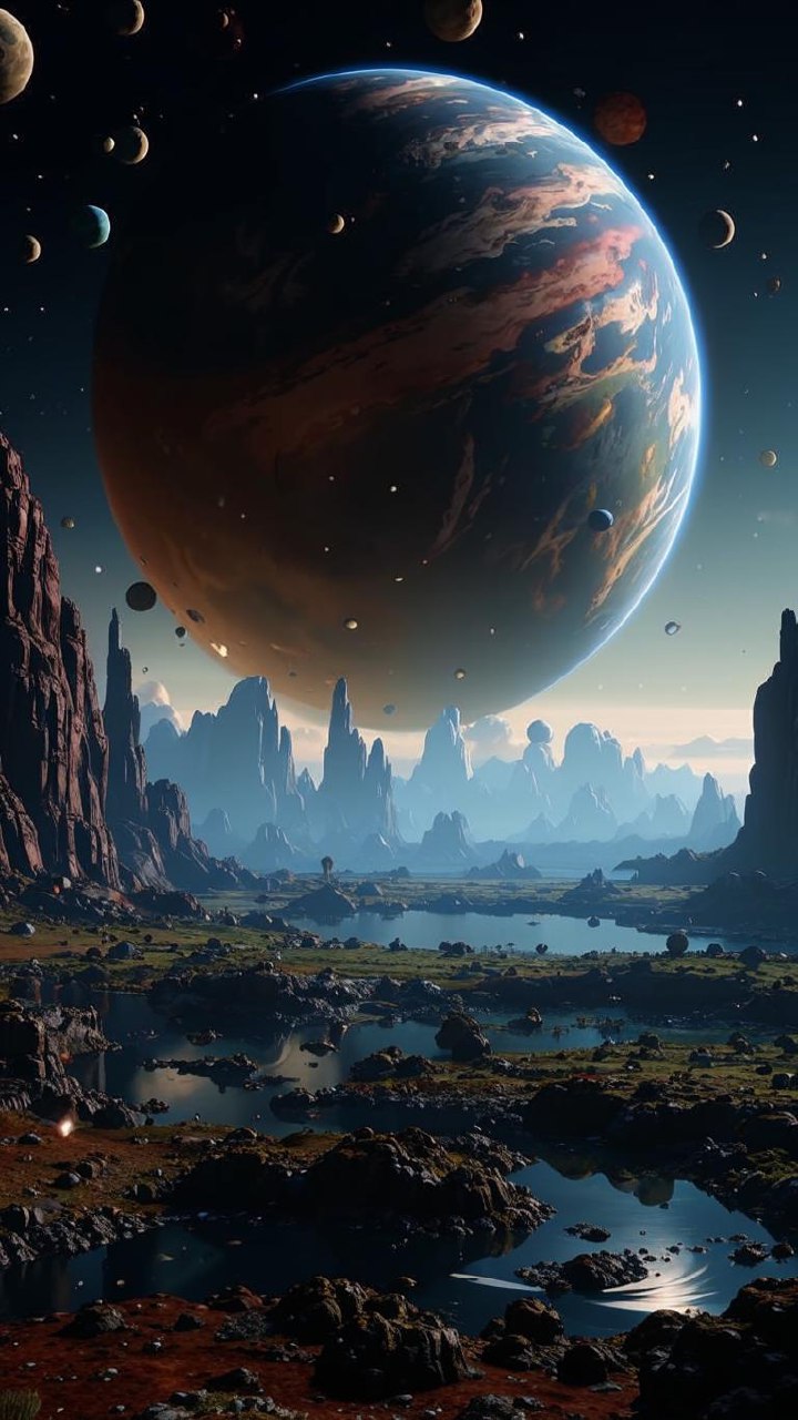 На изображении представлена фантастическая инопланетная сцена с огромной планетой, занимающей значительную часть неба. Вокруг неё расположены множество спутников и мелких астероидов, подчёркивающих её массивность. На переднем плане видна скалистая местность с острыми пиками, которая омывается водоёмами с чистой водой, отражающей окружающие элементы. Небо окрашено в тёмно-синие оттенки, создающие атмосферу космического простора. Вдали видны другие горные образования и водоёмы, что придаёт сцене глубину и транспортирует зрителя в другой мир. Эта сцена напоминает кадр из научно-фантастической книги или фильма, где создаётся ощущение неизведанного и потенциально опасного мира.