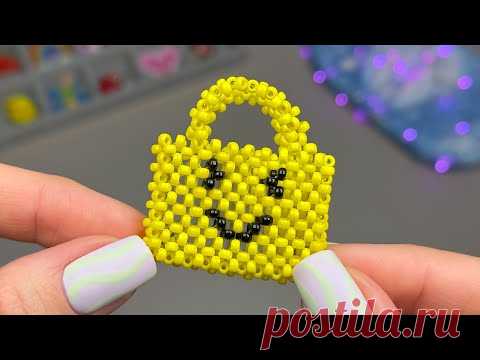 На изображении видны руки, держащие маленькую сумочку, выполненную из ярко-желтых бусин. Сумочка имеет форму прямоугольника с округлой ручкой и украшена черным рисунком в виде смайлика, где бусины образуют глаза и улыбающийся рот. Каждый элемент плетения сумки аккуратно соединен, создавая плотную текстуру. На заднем плане размыто просматривается полка с мелкими декоративными элементами, создающая уютную атмосферу рукоделия в интерьере. Цвета композиции сосредоточены на плане изображения и включают в основном оттенки серого и фиолетового в освещении позади. Видны ногти на руках с белым лаком, что придает акцент элегантности и женственности в кадре. Атмосфера изображения дружелюбная и творческая, подчеркивая элементы DIY и хендмейда.
