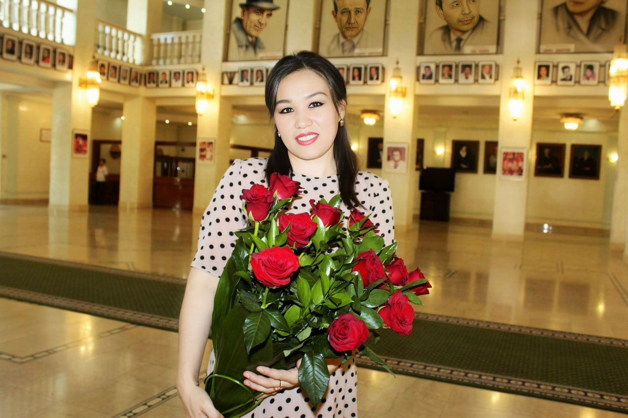На изображении представлена женщина, держащая в руках большой букет красных роз. Она одета в светлое платье с черным горошком. У нее длинные темные волосы, которые свободно спадают на плечи. Женщина улыбается, создавая теплую и дружелюбную атмосферу. В фоне можно заметить интерьеры, похожие на зал или вестибюль с колоннами и портретами на стенах. Освещение мягкое, с несколькими светильниками, создающими приятное и гармоничное пространство. Портреты на стенах напоминают художественную галерею или исторический музей. Платье женщины подчеркивает ее фигуру, а красные розы выглядят свежими и пышными, добавляя изображениям яркость и живость.