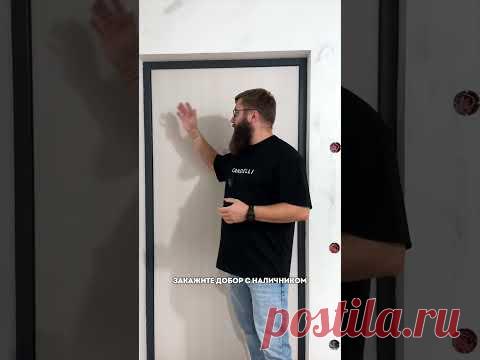 На изображении изображен мужчина с бородой, одетый в черную футболку с надписью «GOODZ!», и светло-голубыми джинсами. На его левой руке надеты часы. Мужчина стоит рядом с дверью светлого цвета с темной рамой, указывая правой рукой на ее верхнюю часть. Фон представляет собой светлую стену, а в нижней части двери видна надпись «ЗАКАЖИТЕ ДОБОР С НАЛИЧНИКОМ». Изображение содержит водяной знак «postila.ru» в нижнем правом углу. Мужчина кажется сосредоточенным на демонстрации двери, возможно, в контексте рекламы или инструкции. Свет падает сверху, подчеркивая текстуру двери и создавая четкие тени. Композиция кадра вертикальная и сосредоточена на фигуре и двери, создавая впечатление профессиональной съемки.