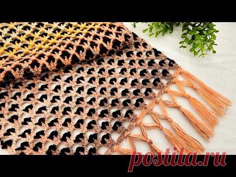 На изображении представлено вязаное изделие, вероятно, плетеный шарф или покрывало, выполненное в технике ажурного вязания. Изделие имеет сложный геометрический узор с чередованием отверстий, создающий эффект легкости и воздушности. Цветовая гамма представляет собой плавный переход от темно-коричневого и черного к светлым оттенкам оранжевого и желтого, что создает красивый градиентный эффект. По краю видны аккуратные кисти, придающие изделию завершенность и стильный вид. В левом дальнем углу можно заметить элементы зеленых растений, которые добавляют изображению природный акцент и контрастируют с текстурой материала. Надпись "postila.ru" внизу изображения идентифицирует ресурс, откуда, возможно, было взято изображение. Атмосфера фотографии теплая и уютная, она может вызвать ассоциации с комфортом и прикосновением рукоделья.