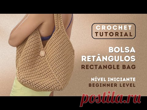 На изображении показана женщина, держащая в руках вязаную сумку бежевого цвета, выполненную крючком. Сумка имеет прямоугольную форму и отличается плотной текстурой вязки. Ремень сумки достаточно широкий, что предполагает удобство ношения. Женщина одета в светлый топ и зеленые брюки, и фон изображения выполнен в теплых бежевых тонах. На самом изображении имеются тексты на английском и португальском языках, которые гласят, что это обучающее видео по вязанию сумок крючком для новичков. В правом нижнем углу присутствует логотип "postila.ru", что указывает на источника материала.