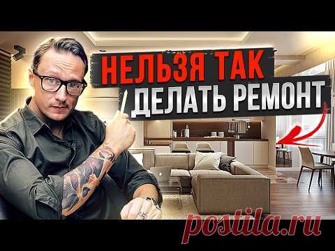 Изображение представляет собой обложку видео с надписью "Нельзя так делать ремонт". На переднем плане мужчина в очках и с татуировками на руке, одет в темную рубашку. Он держит в руке карандаш, указывая им в сторону. На заднем плане изображена современная гостиная с минималистичным дизайном. В интерьере преобладают светлые тона, в центре – удобный диван, мягкие кресла и журнальный столик. По правую сторону комнаты стоят стол и стулья около окна, из которого исходит естественный свет. В углу кухни заметна современная бытовая техника, а пол выполнен из темного дерева. Вся сцена выглядит аккуратно организованной и комфортабельной, подчеркивая чувство порядка и стиля.