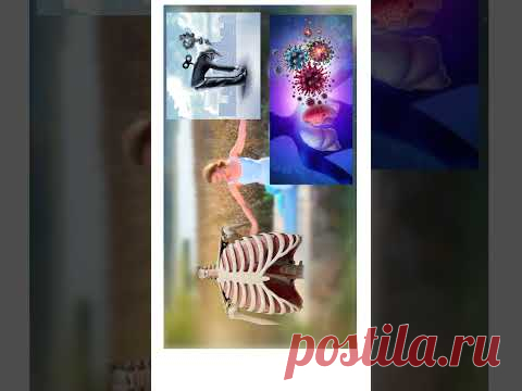 Изображение представляет собой коллаж из нескольких элементов, объединяющихся в тематическую композицию. В верхнем левом углу изображен объект, напоминающий механическую фигуру с заводным ключом на фоне облаков, символизирующий автоматизм или механические действия. Справа от него плавно переходит изображение вирусов или бактерий, выделяющихся яркими цветами на фоне человеческой головы, создавая ощущение вторжения в организм. В центральной части изображена женщина, стоящая с открытыми руками на фоне пейзажа из полей или лесов, создавая ощущение свободы и гармонии с природой. В нижней части коллажа видна рентгеновская проекция грудной клетки, напоминающая о внутреннем мире и здоровье человека. Весь коллаж выполнен с использованием ярких и контрастных цветов, создающих драматическую и динамичную атмосферу.