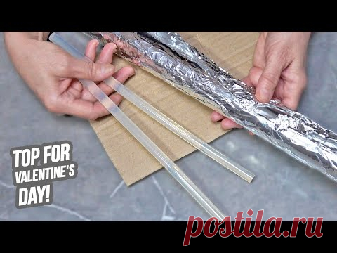 Изображение демонстрирует процесс изготовления подарка ко Дню святого Валентина. На сером фоне видны руки, удерживающие кусок гофрированного картона и металлическую фольгу, свернутую в цилиндр. Рядом расположены две прозрачные пластиковые палочки, создает ощущение, что это часть какого-то декора или поделки. Надпись "Top for Valentine"s Day!" указывает на тематику мероприятия. На изображении также заметен логотип "postila.ru", что может указывать на источник материала или платформу для поделок. Атмосфера креативная и вдохновляющая, возможно, это урок по изготовлению праздничных украшений или подарков своими руками.