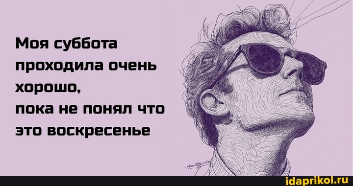 На изображении показан стилизованный рисунок мужчины в солнечных очках, выполненный в монохромной гамме с доминированием фиолетового цвета. Рисунок отличается своей детализированностью, особенно видны линии рисования, формирующие черты лица и волосы. Мужчина смотрит вверх, что придаёт изображению динамичность и некоторую задумчивость. Справа от портрета размещена надпись: "Моя суббота проходила очень хорошо, пока не понял что это воскресенье", напечатанная чёрным, утолщённым шрифтом. Фон изображения светло-фиолетовый, создающий мягкий контраст с чёрными элементами. Внизу справа есть водяные знаки сайтов "postila.ru" и "idaprikol.ru", выполненные в красных и жёлтых тонах соответственно. Атмосфера изображения сочетает в себе юмор и легкую философичность, наполняя его повседневной и узнаваемой ситуацией.