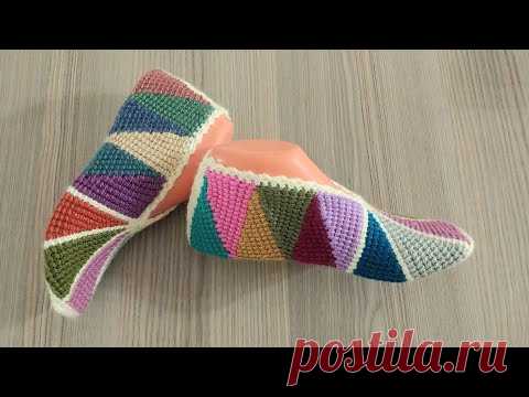 На изображении показаны яркие вязаные тапочки, лежащие на деревянной поверхности. Эти тапочки выполнены в технике вязания крючком с использованием многоцветных нитей. Каждый тапочек состоит из чередующихся треугольных мотивов различных оттенков, включая зеленый, синий, пурпурный, оранжевый и розовый цвета. Общее обрамление выполнено в белом цвете, подчеркивающем насыщенность остальных красок. Тапочки положены так, что видна их боковая часть, и создается впечатление объема и мягкости материала. Деревянная поверхность, на которой они лежат, имеет серовато-коричневый цвет, с видимыми текстурными линиями древесины, что придает композиции уют. В правом нижнем углу расположен водяной знак с надписью "postila.ru", который указывает на источник изображения. Общая атмосфера фотографии теплая и домашняя.