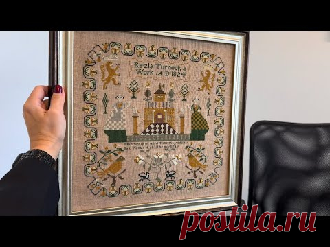 На изображении представлена вышивка, помещенная в эффектную серебристую рамку. В центре вышивки нарисован дом с геометрическим узором, окруженный деревьями и фигурами. В углах изображены птицы и львы. Надпись сверху гласит: "Kezia Turnock Work of 1824", а ниже находится еще один текст. Вышивка выполнена в приятной палитре земляных и зеленых оттенков. Рука в черной одежде с красным лаковым маникюром держит рамку. Фон нейтральный, вне фокуса.