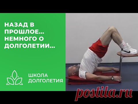 На изображении показан человек в спортивной одежде, выполняющий физическое упражнение. Он одет в белую футболку и красные шорты, а также белые носки и обувь, которая напоминает кроссовки Nike. Человек лежит на спине на красном коврике, подняв нижнюю часть тела, опираясь ногами на стул. Руки вытянуты вдоль тела. Фон нейтрального серого цвета, создаёт спокойную атмосферу. Слева на зелёном фоне написано: "НАЗАД В ПРОШЛОЕ... НЕМНОГО О ДОЛГОЛЕТИИ..." и "ШКОЛА ДОЛГОЛЕТИЯ". В нижнем углу заметен логотип "postila.ru". Это изображение связано с физической активностью и долголетием.
