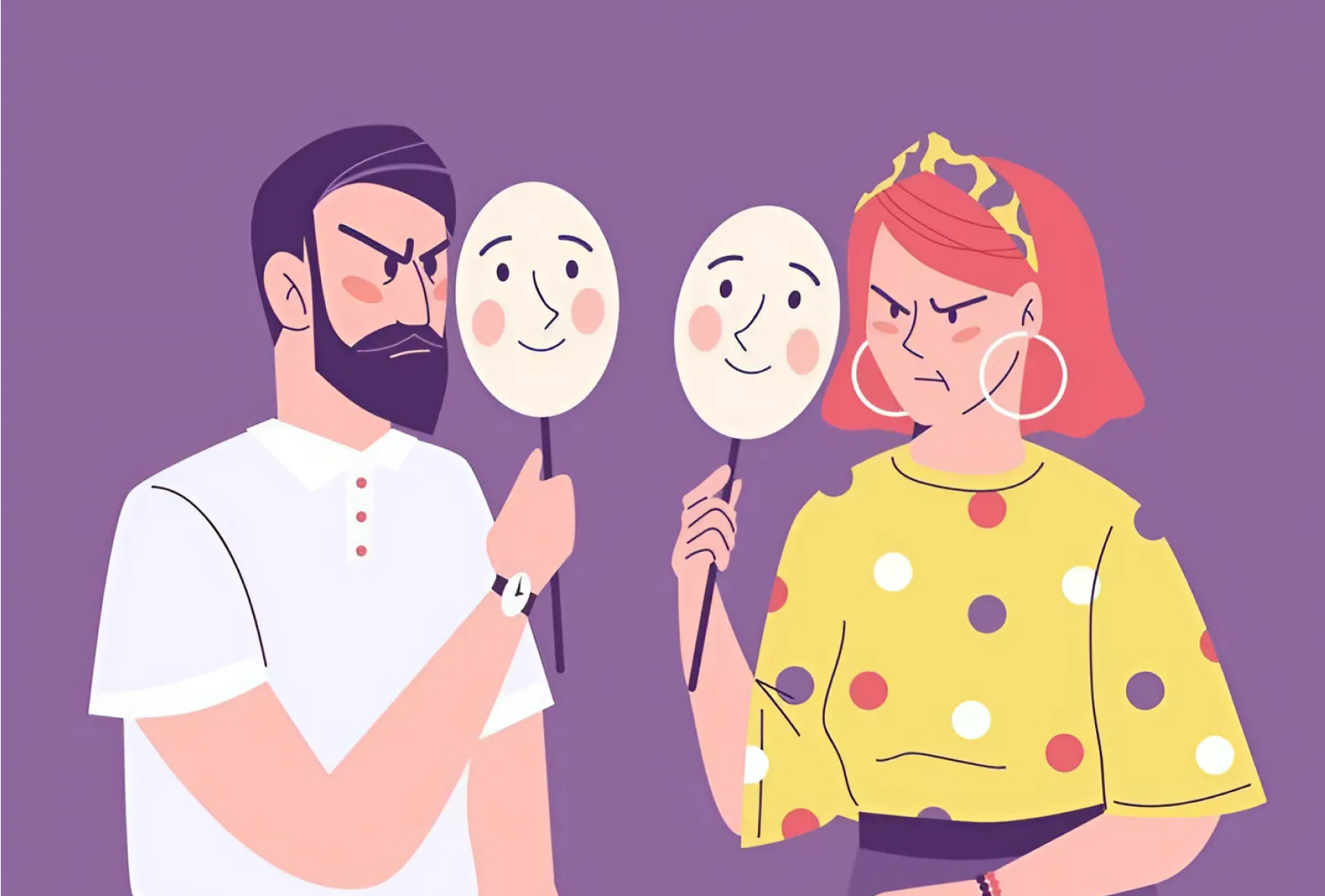 На изображении изображены два человека на фиолетовом фоне: мужчина с темными волосами и бородой в белой рубашке и женщина с рыжими волосами в желтой блузке с разноцветными точками. Оба держат перед лицом картонные маски с улыбками, которые контрастируют с их сердитыми выражениями лица. У женщины большие серьги-кольца и платок на голове, который подчеркивает образ. Мужчина носит часы на левой руке. Создается впечатление фальшивых эмоций, скрытых за масками, что добавляет драматичности и абстрактного осмысления в общую атмосферу. Эмоции на лице персонажей подчеркивают контраст между внутренними чувствами и внешним выражением эмоций. Эта иллюстрация может символизировать идеи о том, как люди часто скрывают свои подлинные чувства за внешними масками.